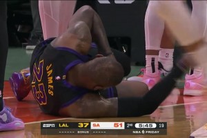 [詹姆斯被打脸] 39岁一场比赛三次被打脸!詹姆斯突破被柯林斯戳到眼睛,痛苦倒地