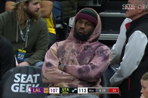 [场边花絮] 胡子白了不少!詹姆斯身穿连帽衫坐场边观战 看着略显沧桑