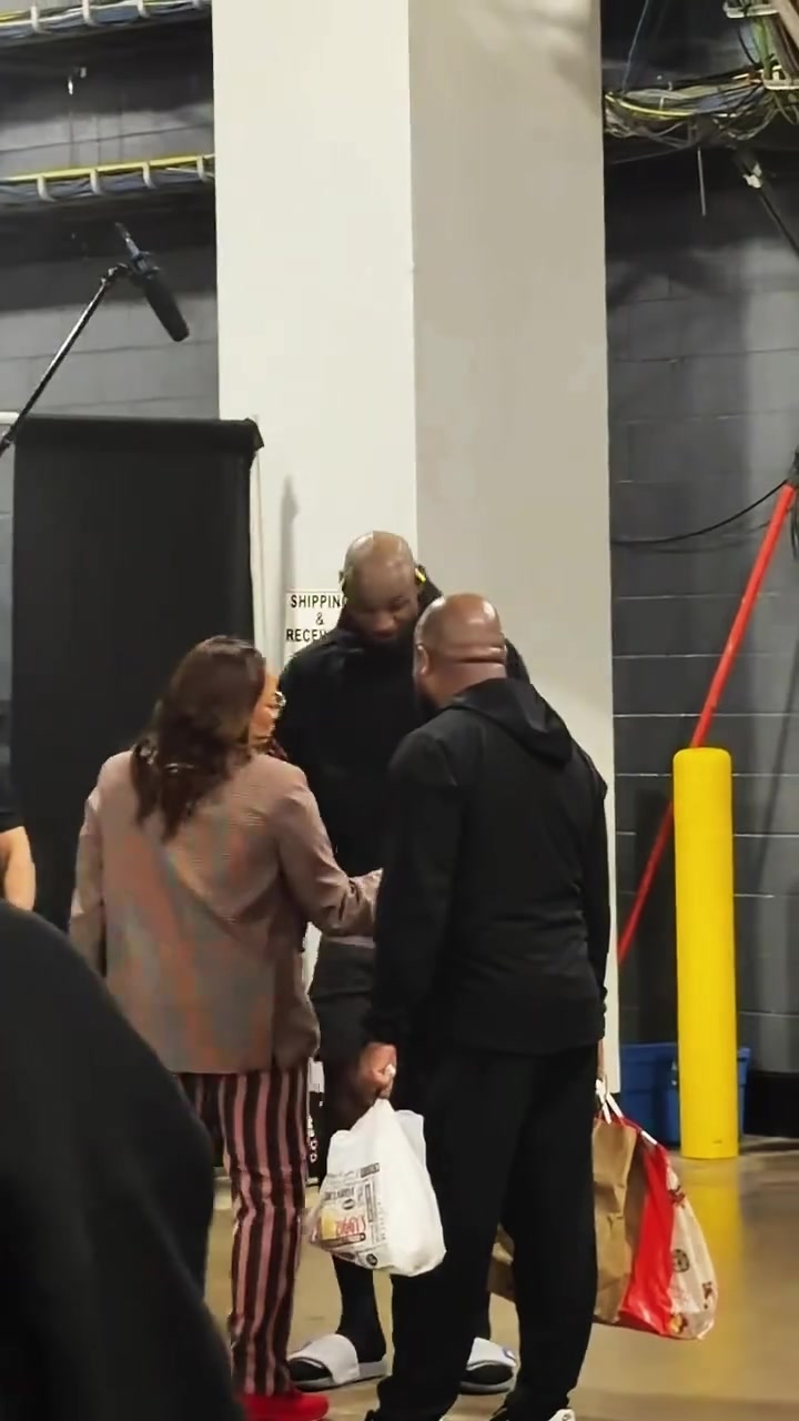 湖人再胜火箭~赛后詹姆斯与好友拥抱寒暄