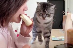 猫咪看主人吃东西求投喂:给我吃一口