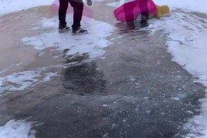 家长带娃冰面打溜滑孩子使劲摔倒