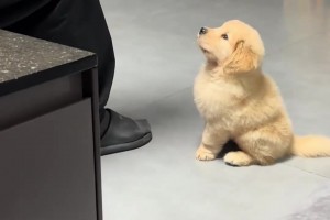 网友晒教育金毛幼犬小狗乖乖坐着超可爱