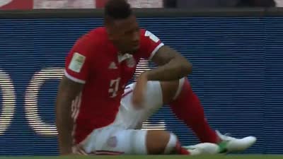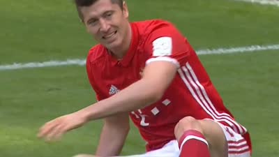 第35分钟,穆勒脚后跟磕球,科斯塔弧顶附近突然远射一脚,皮球擦右侧立柱偏出。随后角球开出,莱万高高跃起头球攻门偏出。
