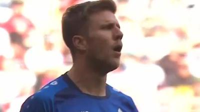 一分钟后,拉菲尼亚右路挑传,穆勒跟进鱼跃头球攻门被埃塞尔飞身扑出,随后博阿滕外围突施冷箭,禁区内穆勒一闪,皮球滑门而出。