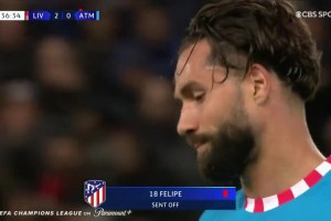 [红牌罚下] 马竞十人作战!费利佩踢倒马内后主裁出示红牌罚下